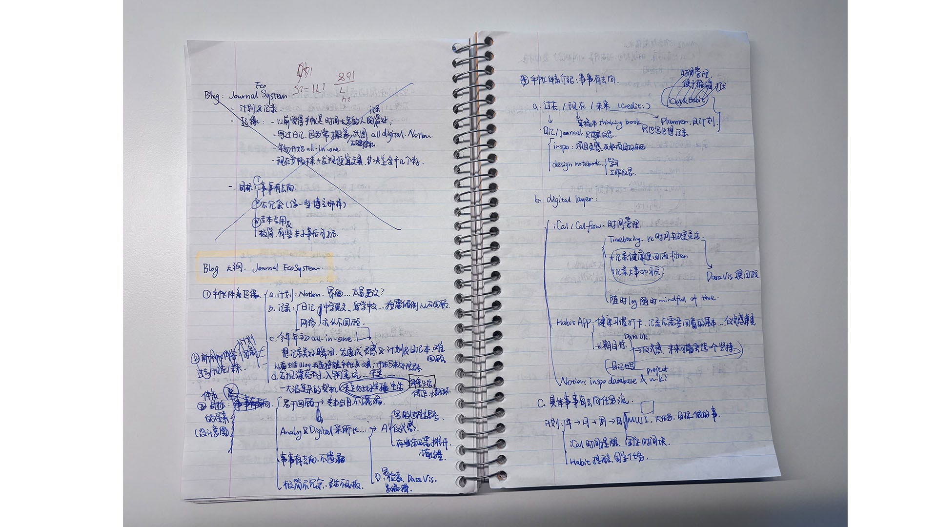 草稿本:记录脑子里的新想法。它非常适合工作时把零碎的跑题的想法记下来等下班再研究,防止自己一打开手机就走神走很远。此外,我在工作和生活中都开始通过大量的书写来辅助思考,把一个模糊的大目标拆解成细分的小任务,这极大地提升了我的行动力。