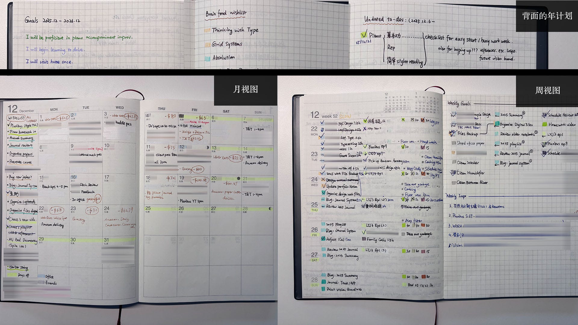 计划本背后有一些格子内页,我将新一年的大概的目标、想看的东西、以及没确定日期要做的事情写在这里,至少每月回顾一次,按需提上当月日程。